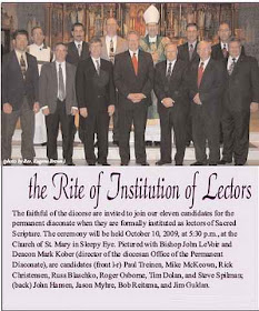 On October 10, 2009, eleven candidates for the permanent diaconate will be instituted by Bishop John M. LeVoir as lectors of the Church. The ceremony will be held at 5:30 p.m. at the Church of St. Mary in Sleepy Eye. One year ago, the eleven men were admitted as candidates for the order of deacon in a similar ceremony.